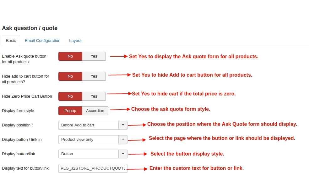 Select YES or NO to enable and disable the Ask quote button for all products.