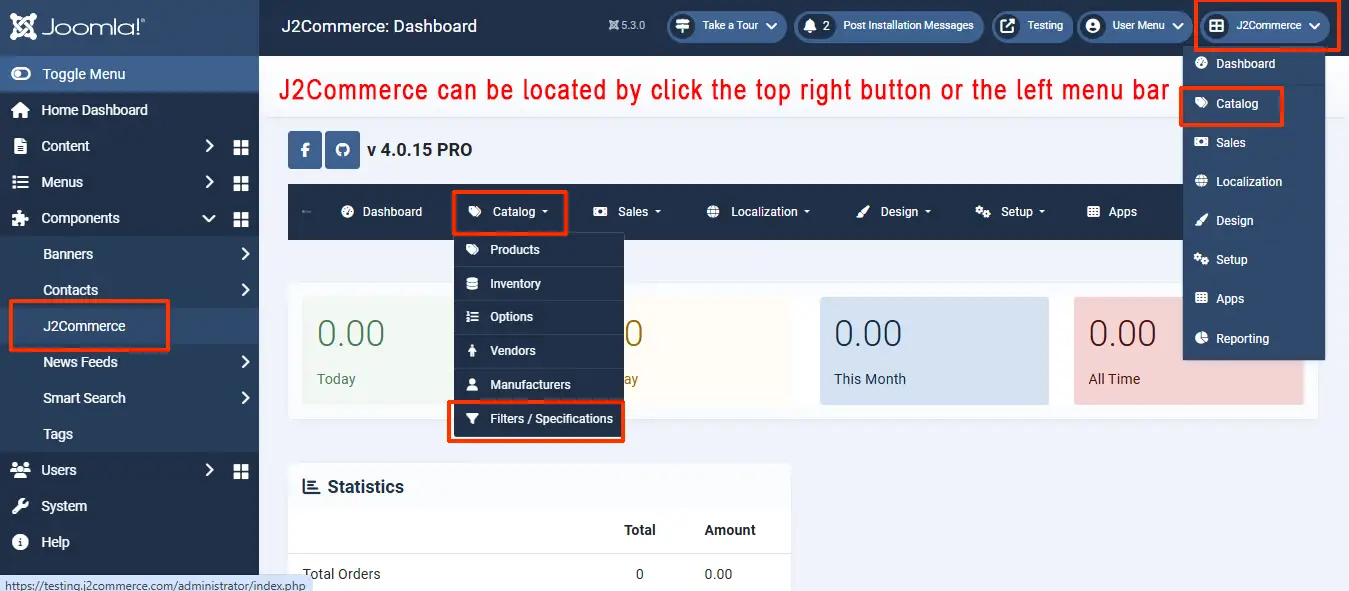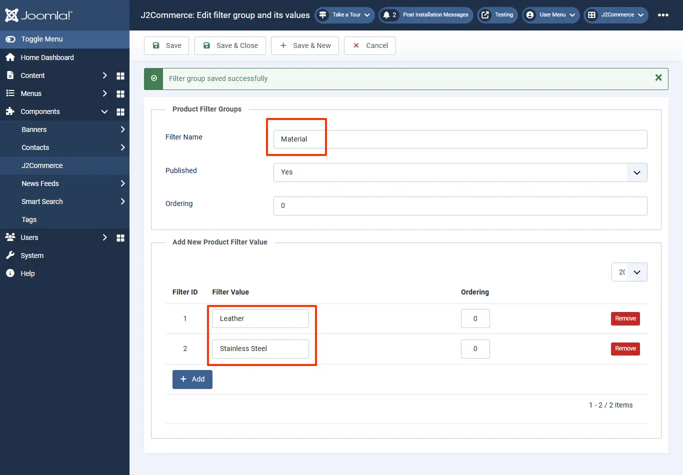 * Navigate to J2Commerce > Catalog > Filters/ Specifications.