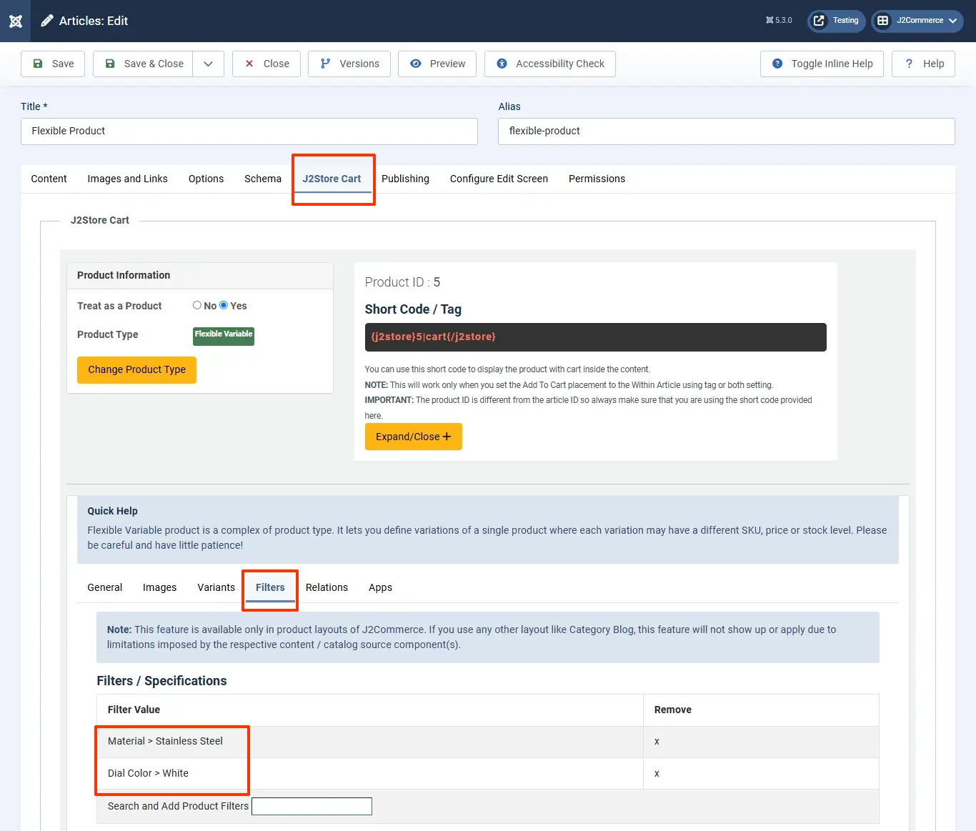* Move to the product’s article page and click on the filters section under the J2Commerce (J2Store Cart) tab.