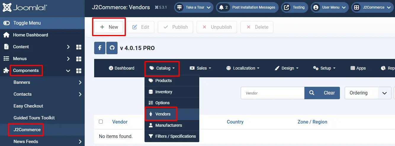 Step 1: Create a Vendor by navigating to Components > J2Commerce > Catalog > Vendors