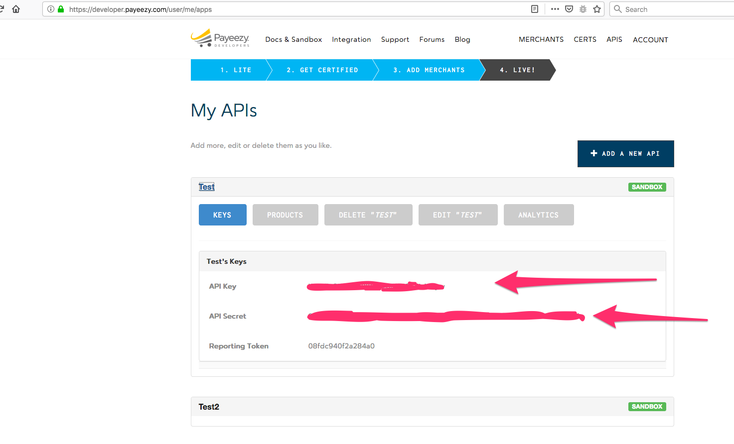 API key Enter the valid API key associated with your Payeezy account. You could get the API keys by logging in to the Payeezy dashboard and navigating to the API menu:
