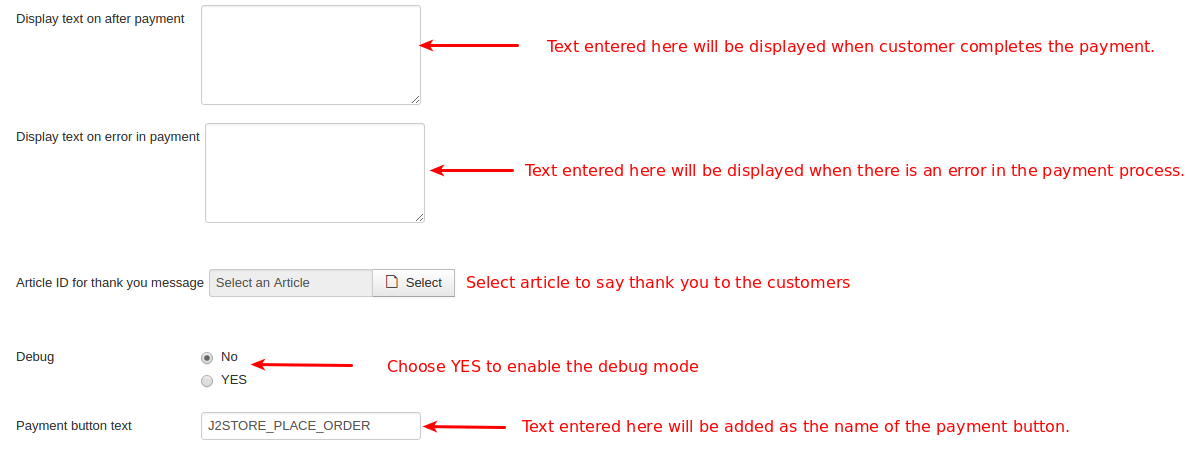 Display text on after payment The text entered here will be displayed when customer completes the payment. You can enter a language constant as a value here if you are using a multi-lingual site and then write a language override. Refer the Display text on selection parameter.