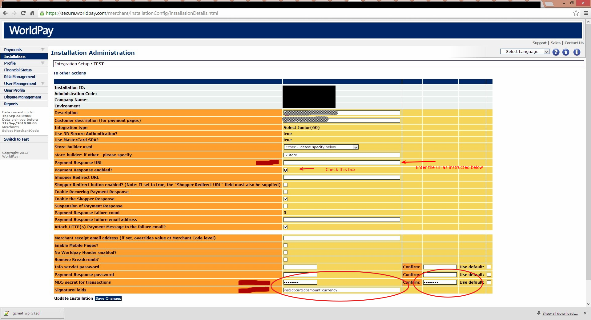 Secret MD5 key This is the key you have created in the previous step in your World Pay merchant interface.