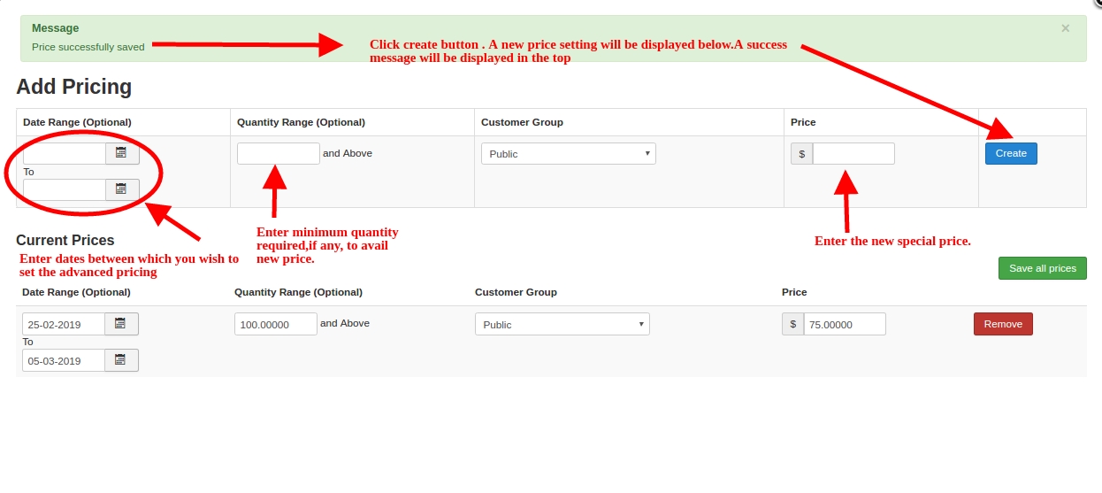 Advanced Pricing: Enter the dates between which the special price is offered, the minimum quantity to avail the special price, the user group eligible, the special price and click ‘Create’. Now, the new price is listed as a row below. You can further edit and save or delete if you want. You can also leave the date range empty if you want the special pricing to always be available.
