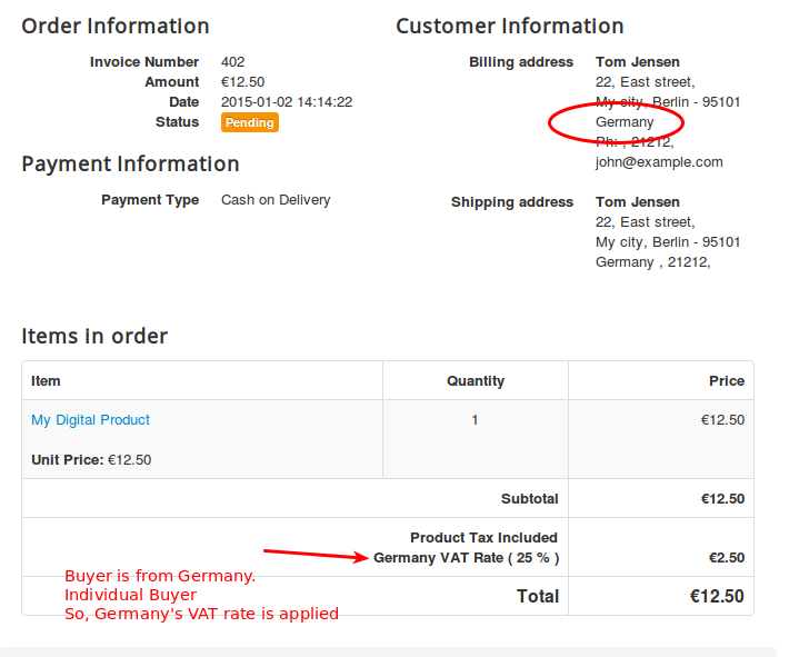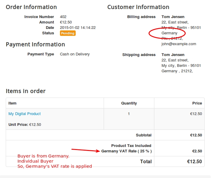 The buyer is from Germany and he is an Individual customer. So we are charging him the Germany’s VAT rate of 25 %