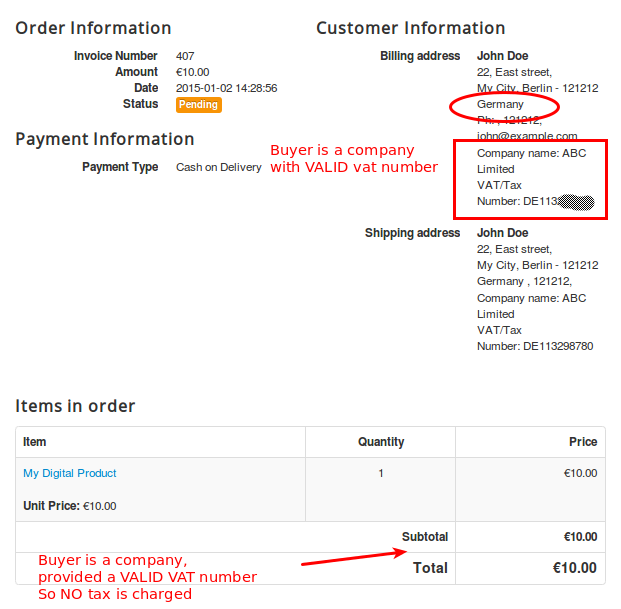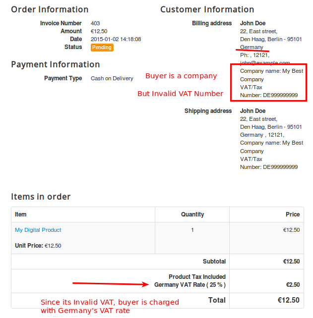 The customer is from Germany. He has entered a company name. But his VAT number is INVALID. So we apply the Germany’s VAT rate of 25 %.