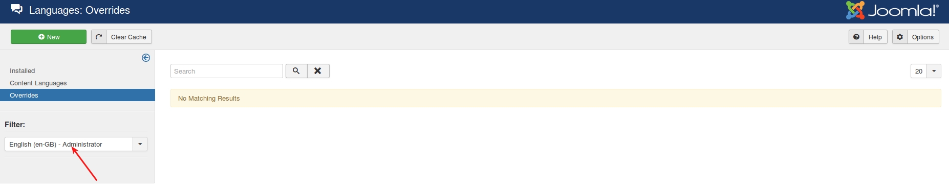 Go to Extensions > Languages > Overrides and set the filter to Administrator location, and then click New.