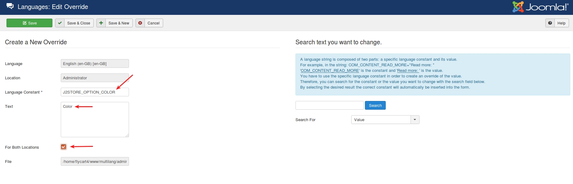 2. Enter the language string (which is given as an option name) and give its value in the Text box. Choose For Both locations and save.