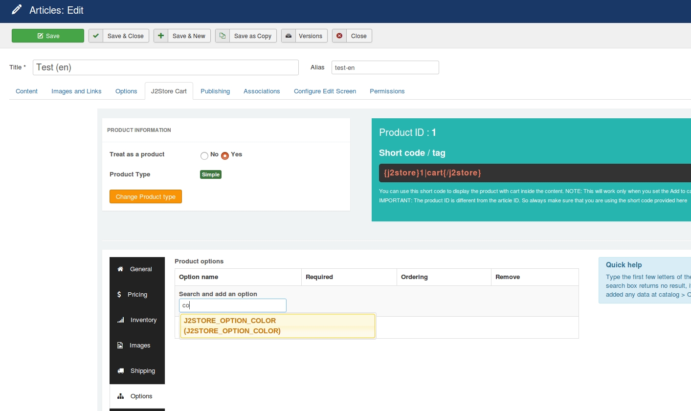 Move to the J2Commerce (J2Store Cart) tab and then navigate to the 'Options' tab